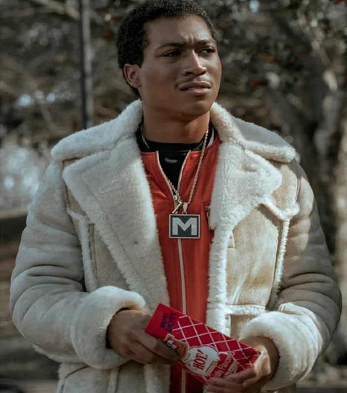 The Meech Shearling Coat itself has multiple features like it is made up of the most premium quality 100% real suede leather. It has a soft shearling lining on the inside so you can stay comfy & cozy. It has the most luxurious notch-style lapel collar to add to its fashion. The front of the coat is open with a buttoned closure option. It has full-length sleeves with open hem cuffs. The attire has two pockets outside on the waist, plus two pockets on the inside so you can keep your belongings nearby. The coat is worn by Meech in the series.