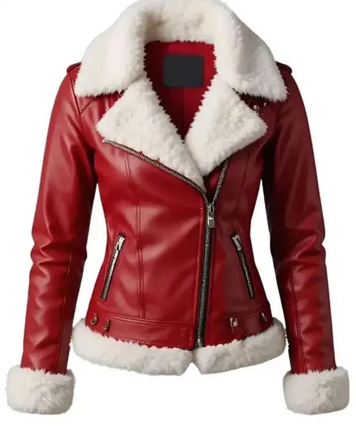Womens Santa Claus Red Merry Christmas Shearling Leather Biker Jacket